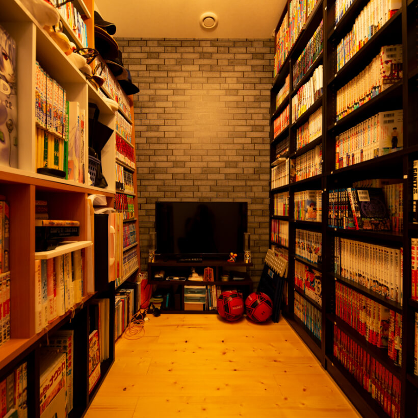 ご主人: 漫画が趣味で新旧あらゆる漫画を集めています。ずっと家を建てるなら専用の趣味の部屋が欲しいと思っていました。棚いっぱいに並べた漫画に囲まれた隠れ家のような空間になり満足しています。 入り口の2階の廊下からみると、突き当たりに、一見壁のように見えますが、隠し扉のようになったオリジナルの扉になっています。